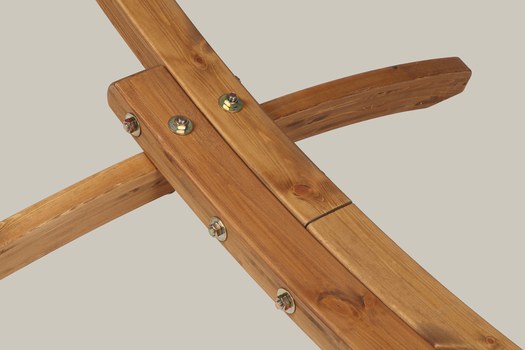 Soporte de madera laminada con hamaca A3003. Dimensiones: 310x120x130 cm.