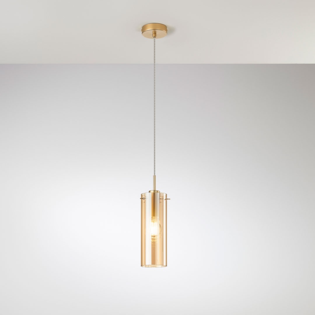 Lámpara colgante Magic dorada/ámbar 1xE27 10x150 cm : Elegante y moderna lámpara colgante con acabado dorado y cristal ámbar. Ideal para salón, comedor o cocina, compatible con bombillas E27, crea una iluminación cálida y refinada que realza cualquier espacio.