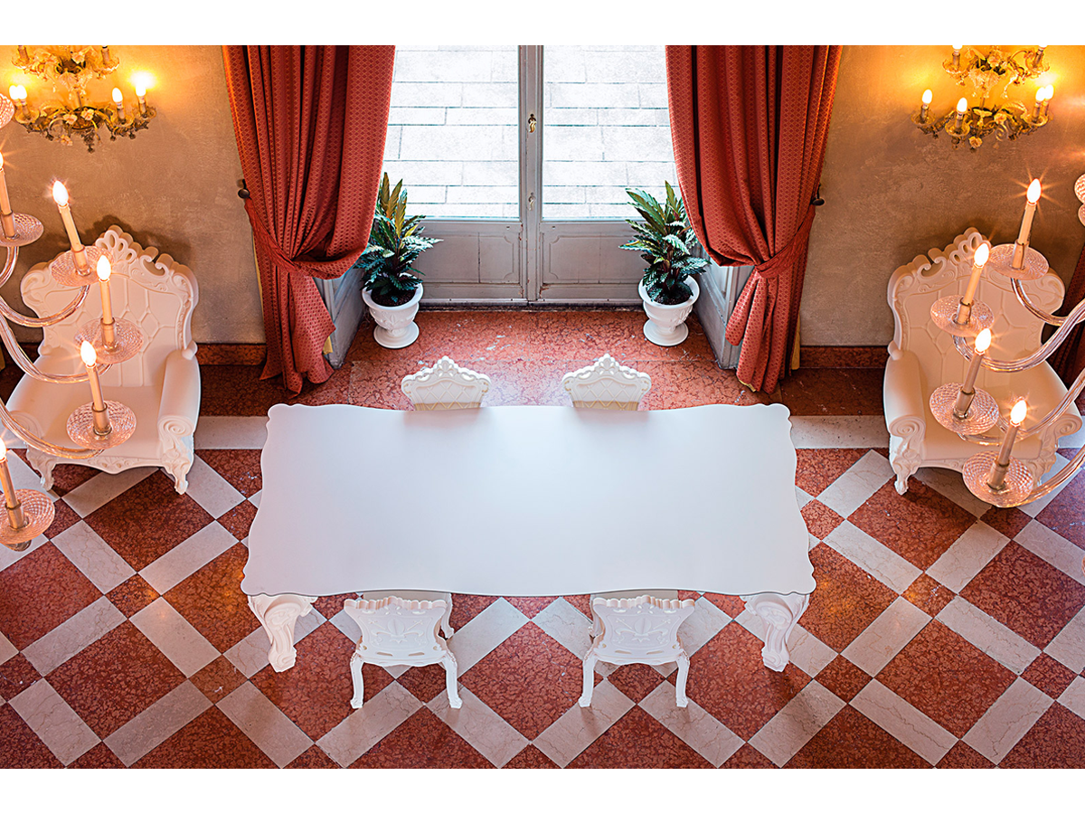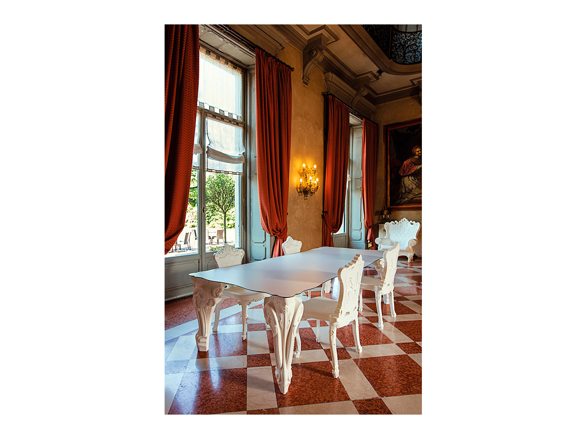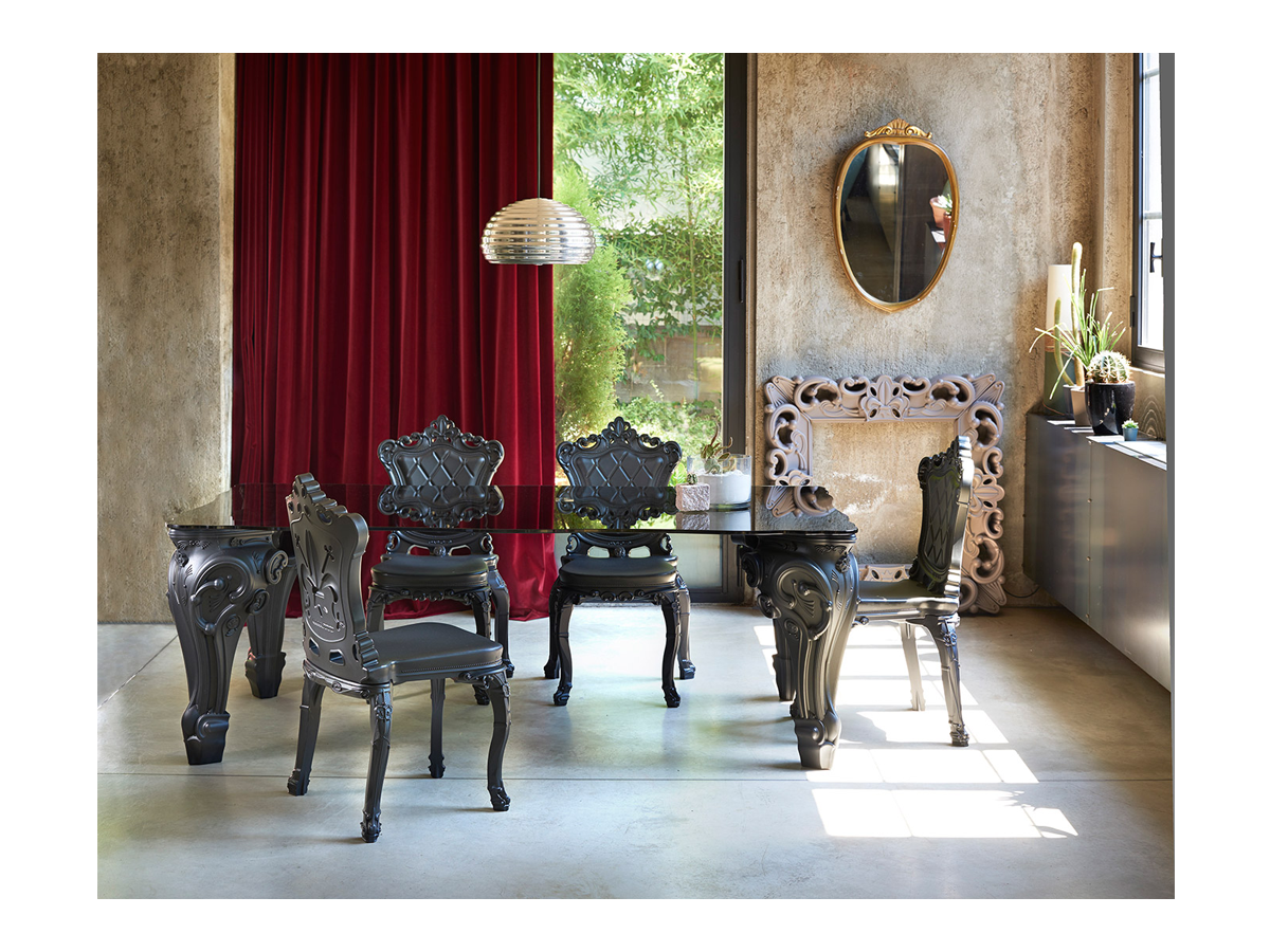 La mesa Sir of Love está diseñada por Graziano Moro y Renato Pigatti, parte de la colección Design of Love. Las majestuosas patas de las esquinas de la mesa son de polietileno, la tapa es de vidrio templado ahumado, lo que permite elegir el aspecto final del mueble. La elección del color se refiere a las patas de la mesa.