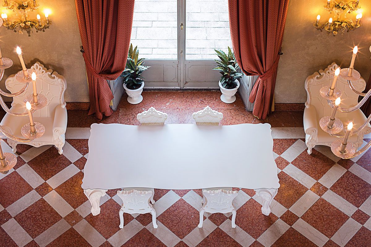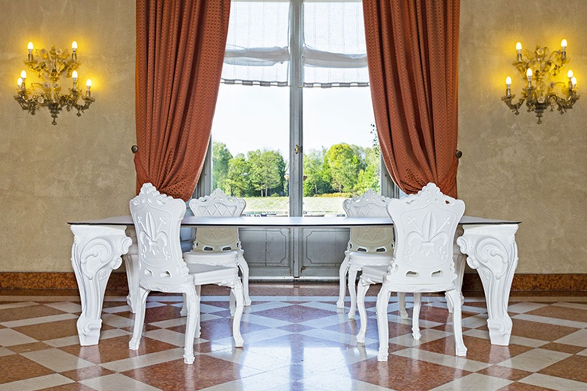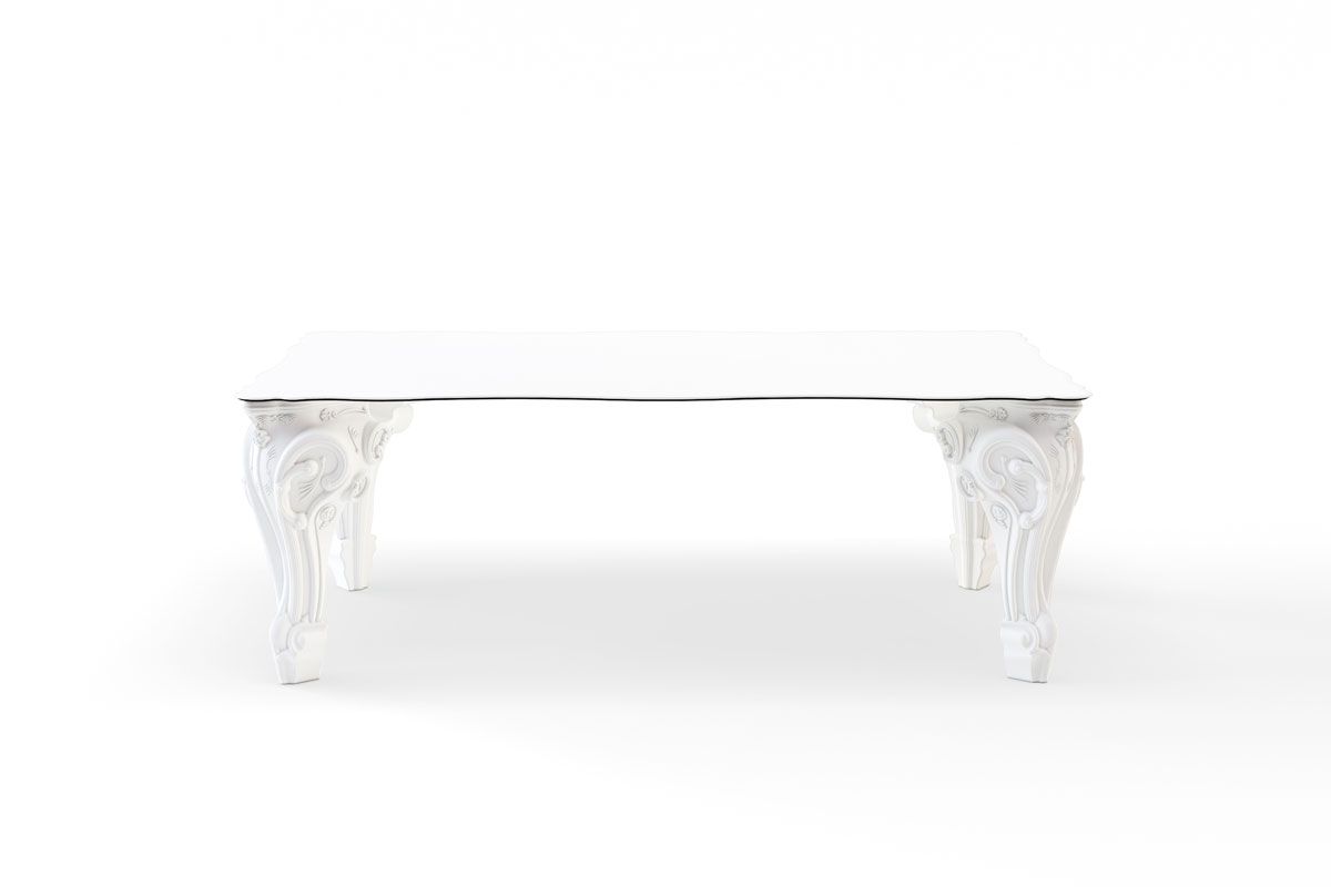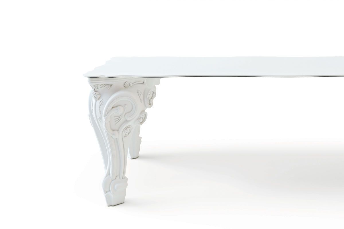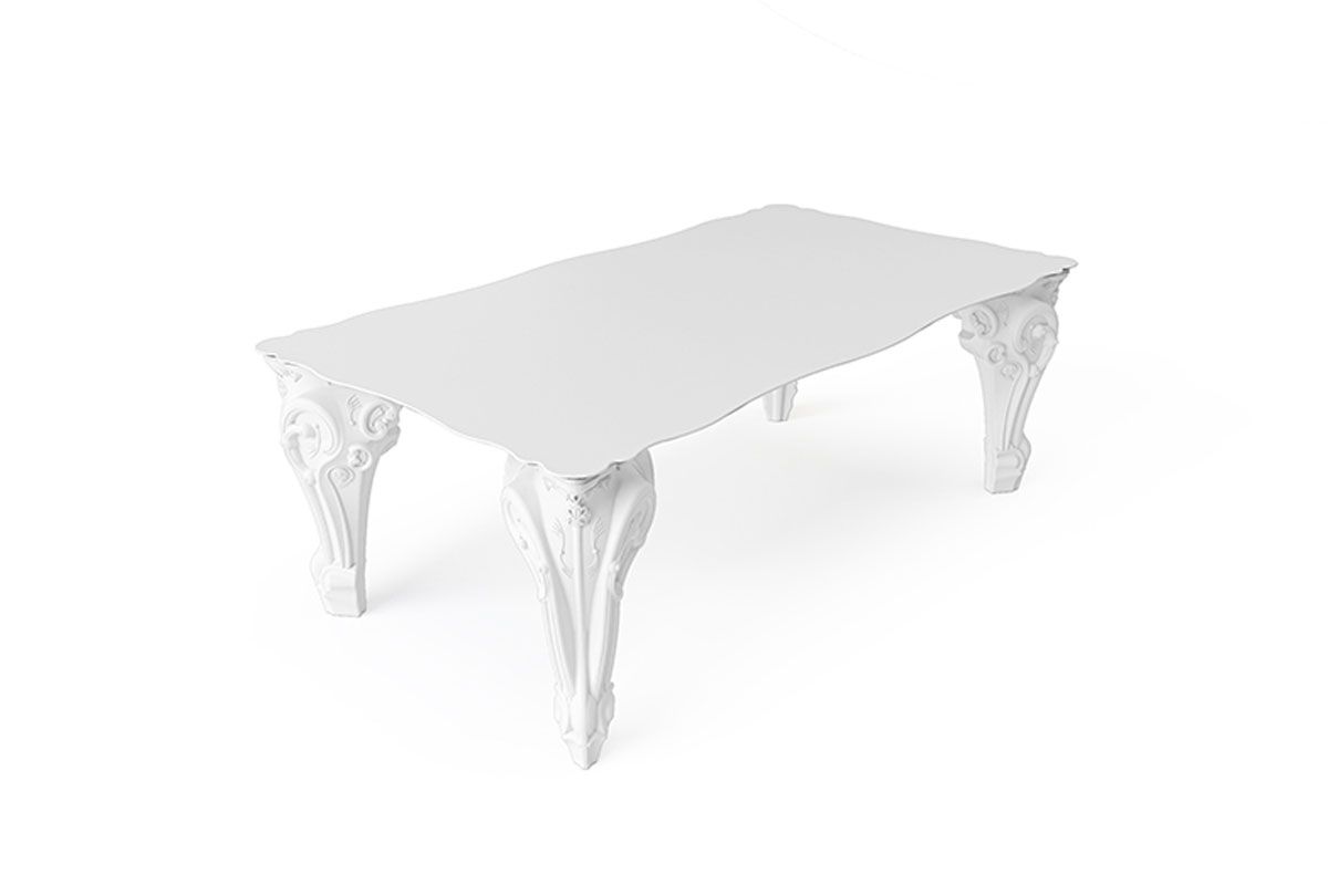 La mesa Sir of Love está diseñada por Graziano Moro y Renato Pigatti, parte de la colección Design of Love. Las majestuosas patas de las esquinas de la mesa están hechas de polietileno, la tapa en HPL. Con su imponente apariencia es ideal para decorar salones, contract, pero también espacios domésticos, convirtiéndose en un elemento clave de su interior que con un toque rococó transformará cualquier ocasión en un evento de gala. La elección del color se refiere a las patas de la mesa.