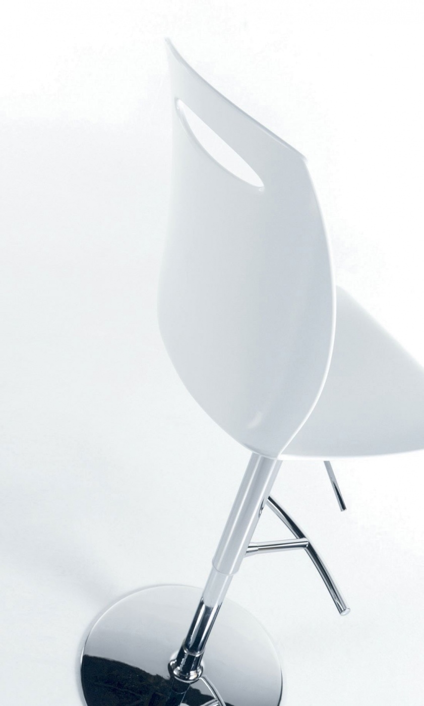 Taburete ajustable en altura con estructura de aluminio y acero, pistón de acero y asiento giratorio en tecnopolímero compuesto blanco.