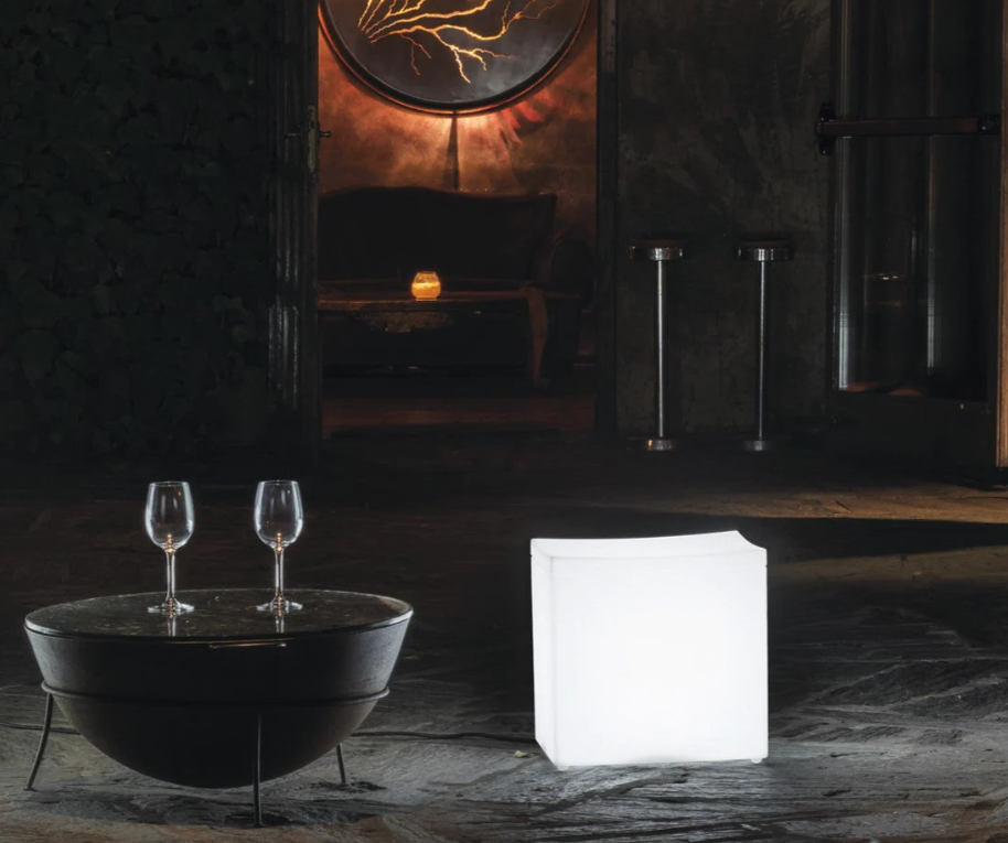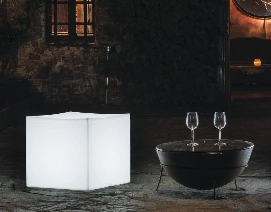 El cubo fue concebido específicamente como un asiento, diseñado para satisfacer la necesidad de muebles de exterior extremadamente prácticos. El asiento, ligeramente curvado hacia el interior, aporta suavidad a una forma que de otro modo sería rígida. Además, en la versión iluminada, la luz procedente del interior aporta al cubo un toque de ligereza y magia.
