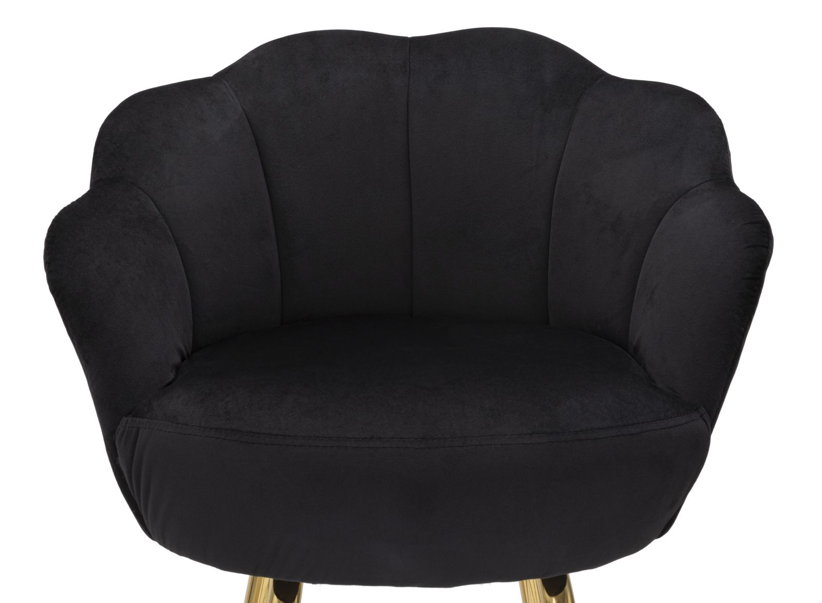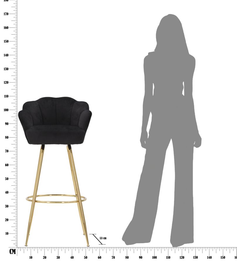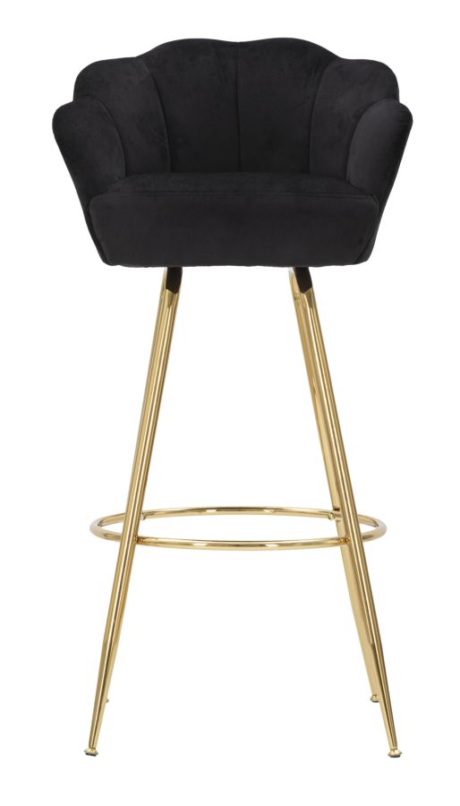 Taburete de bar en terciopelo negro con patas doradas con un diseño particular que recuerda los pétalos de una flor. La elegancia del terciopelo y el metal dorado se unen para crear un estilo único.