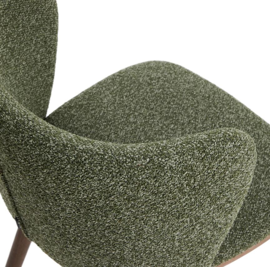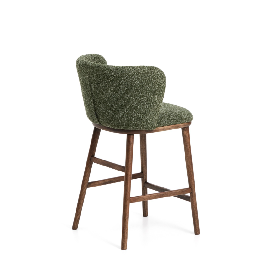 Taburete Ciselia en chenilla gruesa de color verde oscuro y patas de madera maciza de fresno con acabado nogal.