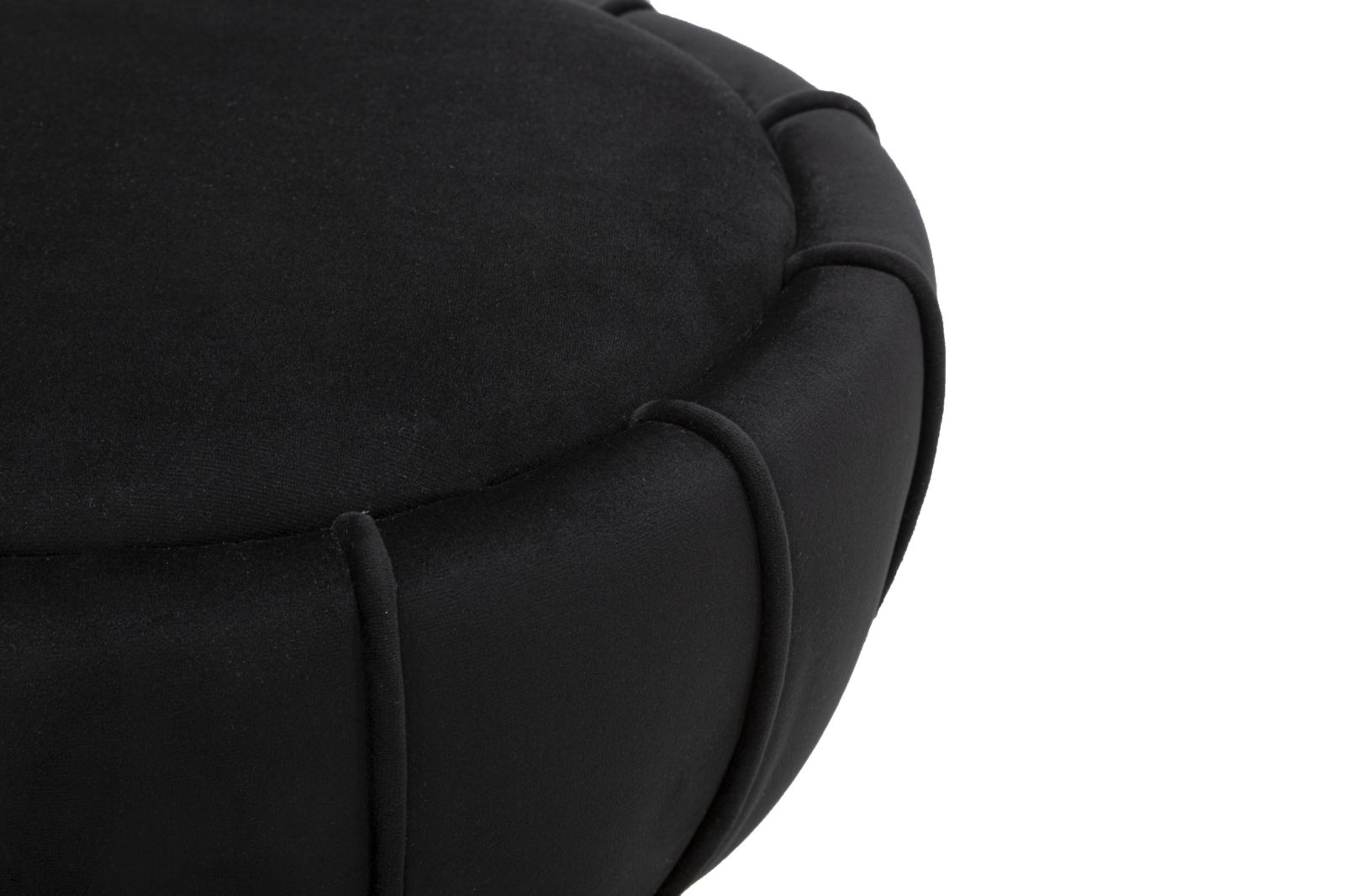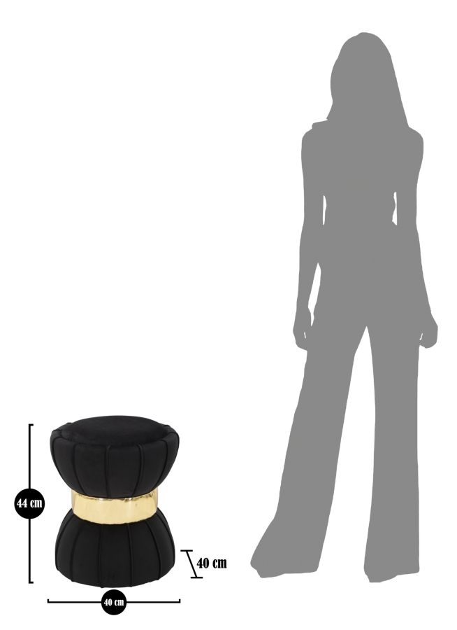 Taburete redondo tapizado en terciopelo sintético con una elegante banda decorativa central dorada. La forma se asemeja a un reloj de arena.