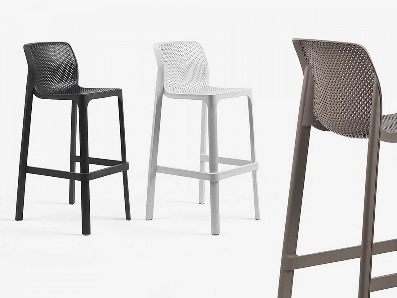 Líneas fluidas y limpias para el Taburete Net Stool monocarcasa de resina de fibra de vidrio disponible en seis colores sofisticados y polivalentes con efecto mate. Decorado con un particular patrón de agujeros cuadrados, leitmotiv de toda la colección Net.