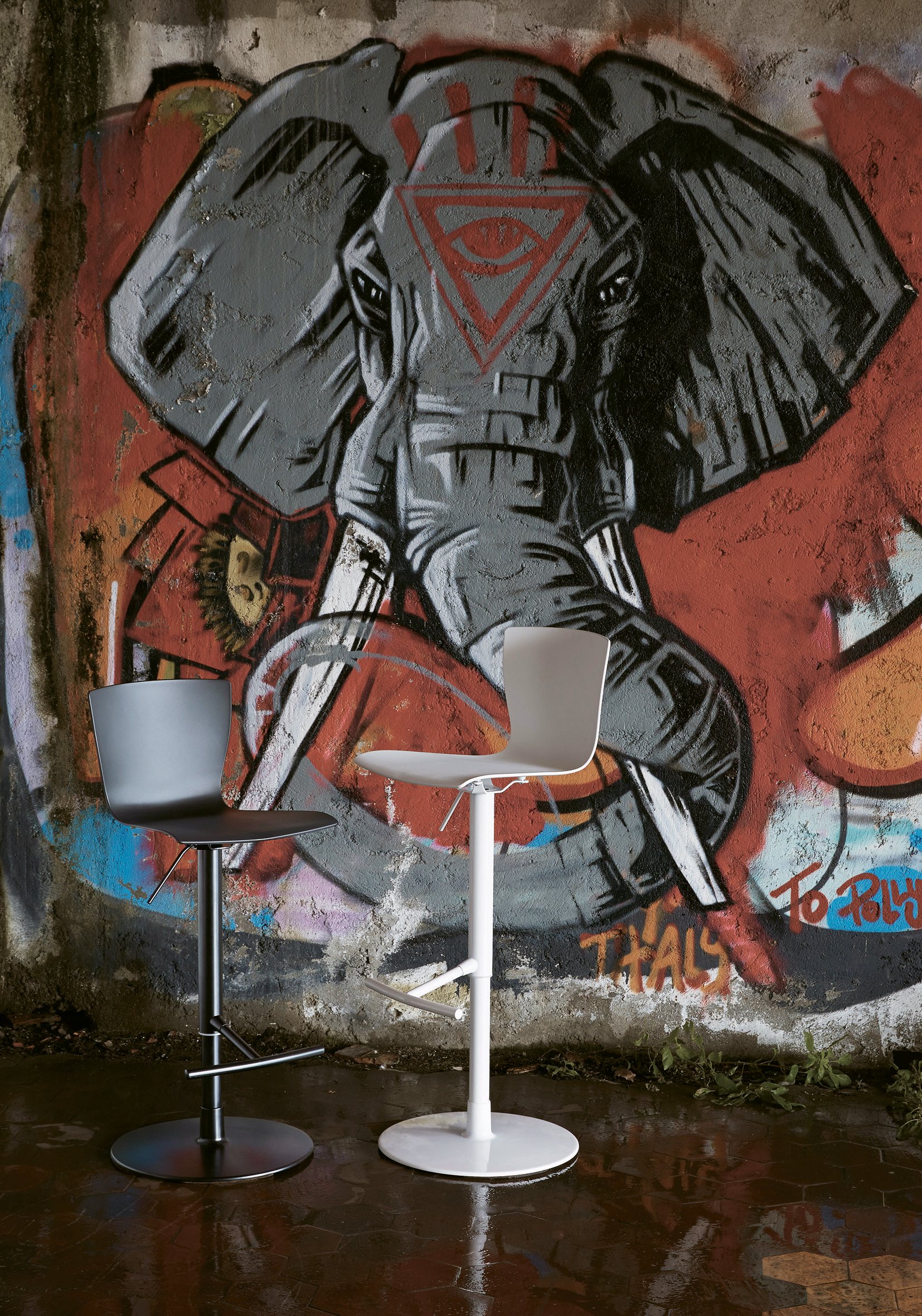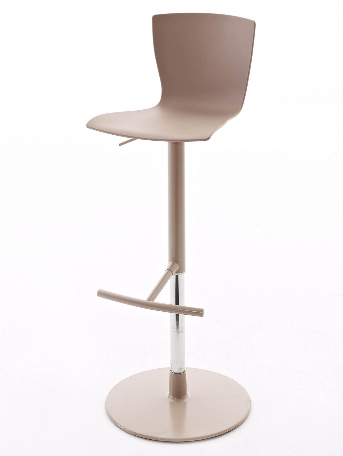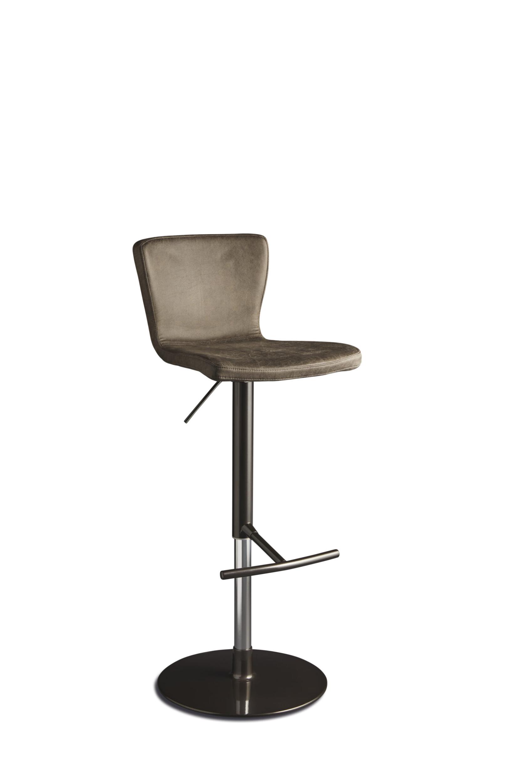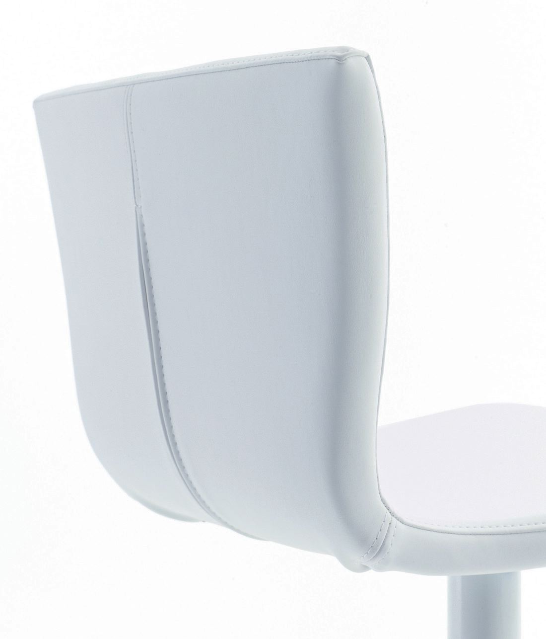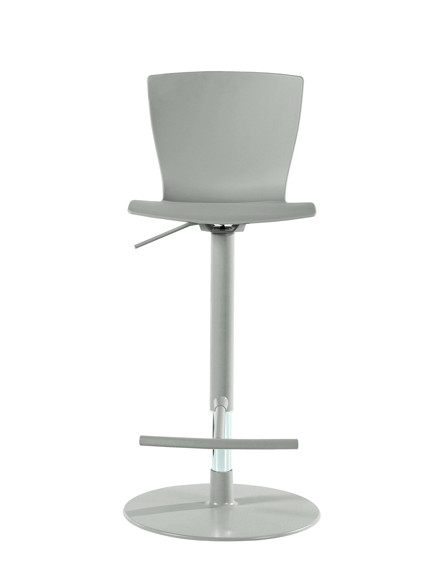 Taburete ajustable en altura con estructura de aluminio y acero, pistón de acero y asiento giratorio en polipropileno de tacto suave o tapizado en cuero ecológico.