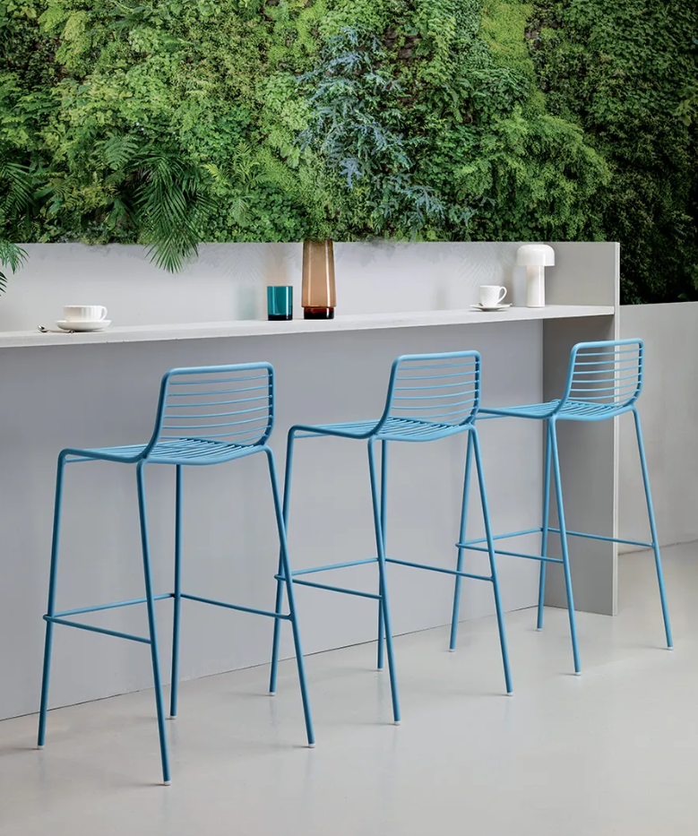 Los asientos ligeros y apilables ofrecen practicidad sin renunciar al estilo, mientras que las mesas, en la versión de 75 cm de altura, completan el conjunto con equilibrio y funcionalidad.