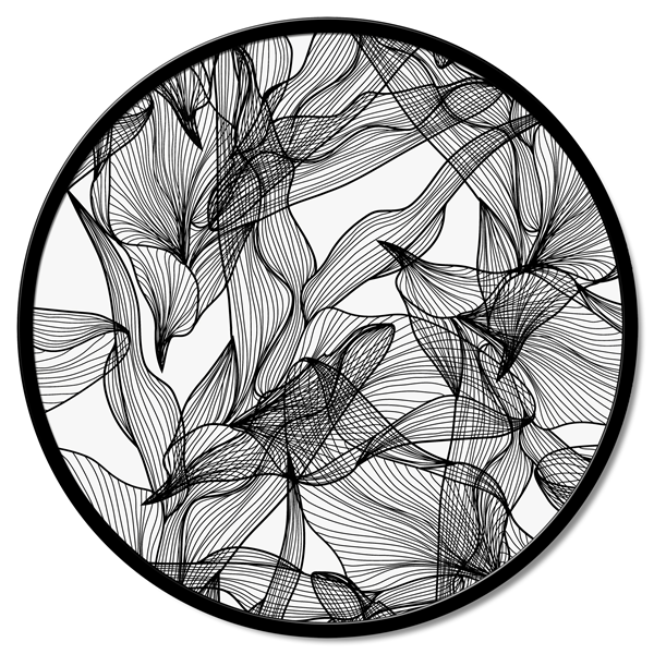 Panel redondo de fibra de madera recubierto de lona de puro algodón estampado en alta definición y con estructura de metal lacado mate.