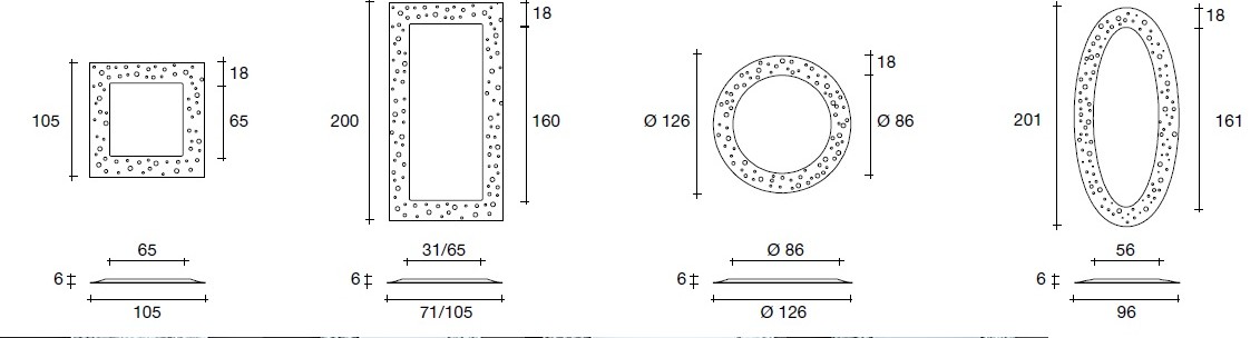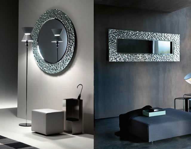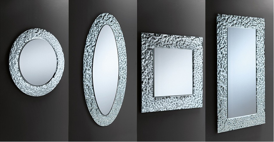 Colección de espejos de vidrio fundido de 8 mm con respaldo plateado con decoración artística en relieve, espejo plano de 4 mm, marco posterior de metal pintado.